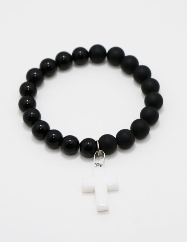 10mm half flat black and half shiny black agate bead with cross. Item 8 inches and handmade in Jamaica. Items will be shipped from Jamaica.