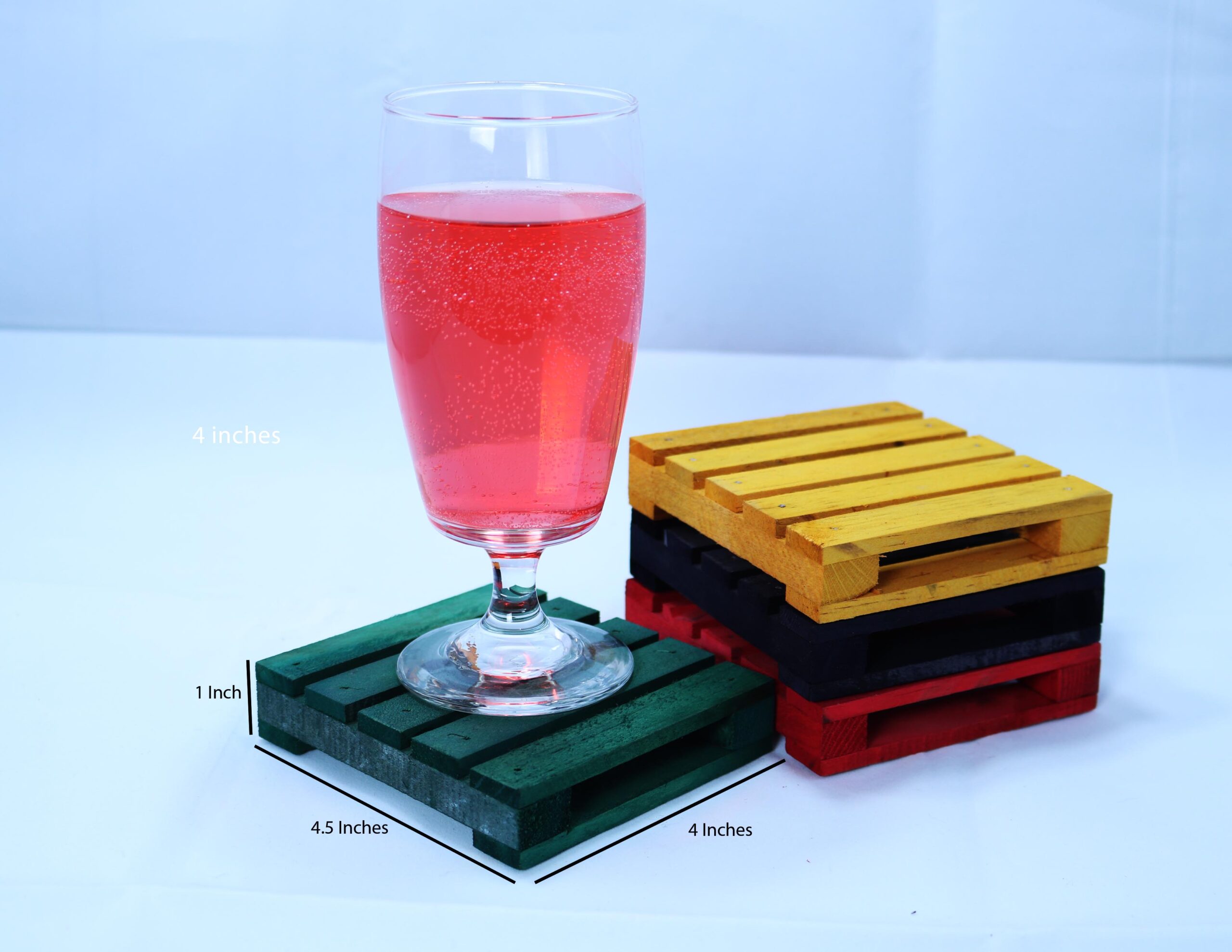 Pallet coaster comes 4 to a set. Available in plain and coloured. 4 pieces to a set. The size is 4 inches width by 4.5 inches by 1 inch high.