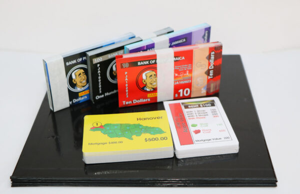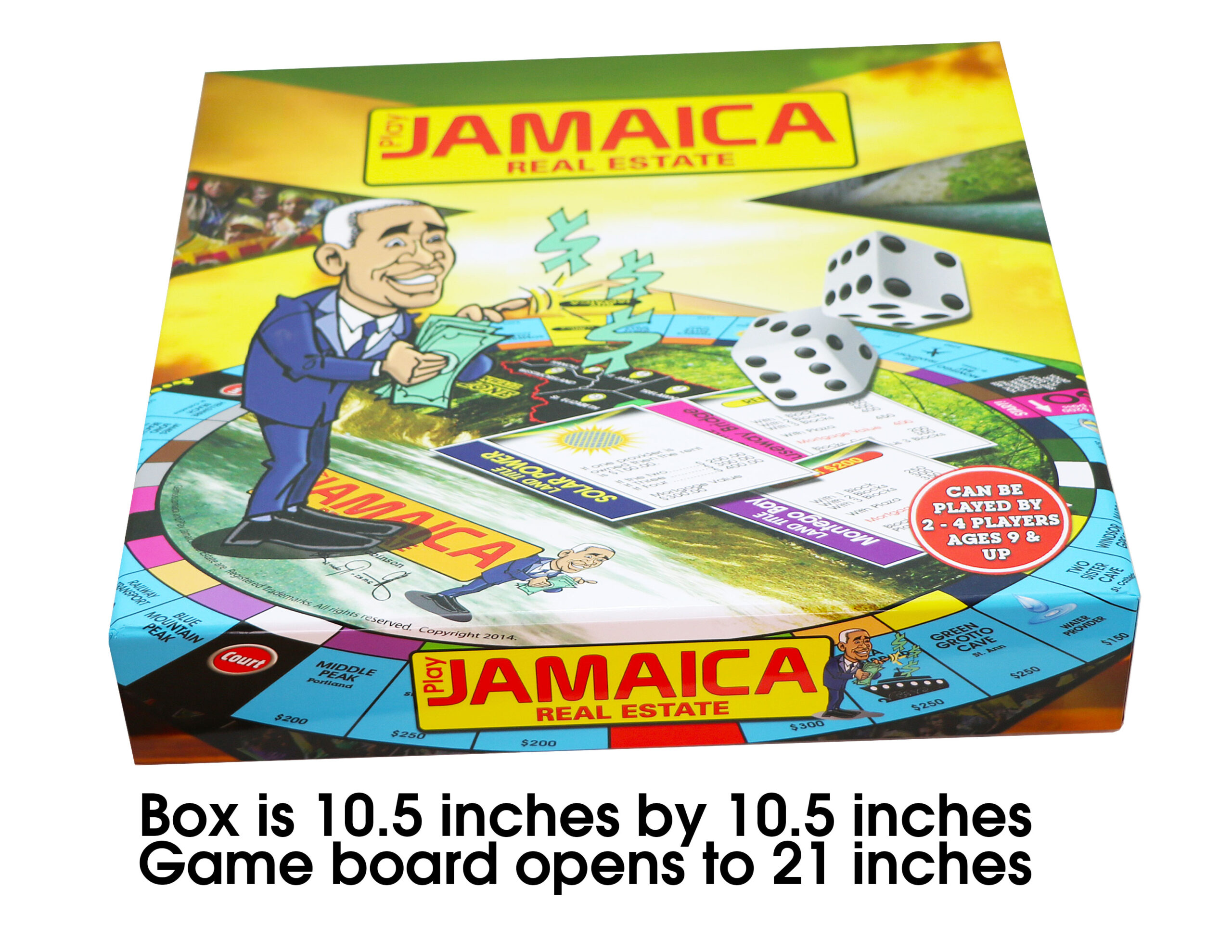 Play Jamaica real estate is a new game in Jamaica and the world. The game is all about trading properties with a jamaican flavour. Game box is 11 inches by 11 inches, easy to transport. The board is quad fold to 10.5 by 10.5 inches and opens up to 21 inches by 21 inches. The game includes 2 dice, 4 tokens, money, title deeds, buy jamaica cards and instruction booklet. Fun Filled Family Game. Age range from 9 years to adult.